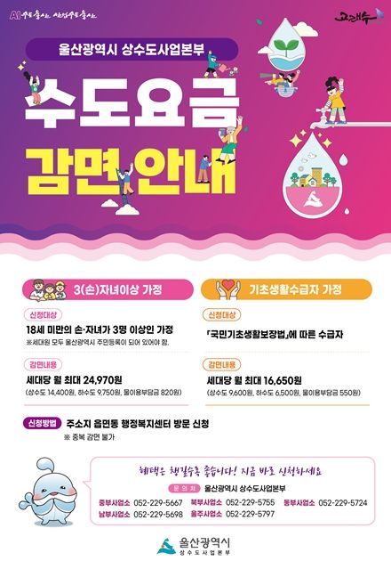 (포탈뉴스통신) 울산시 상수도사업본부는 지난해에 이어 올해도 관내 3자녀(손자녀 포함) 이상 가정 및 기초생활수급자를 대상으로 상·하수도 요금 감면 혜택을 지원한다고 밝혔다.