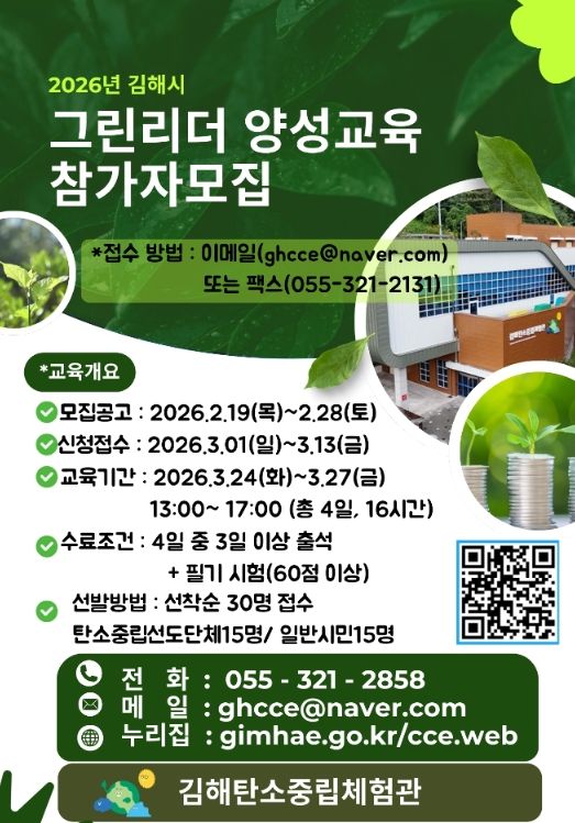 (포탈뉴스통신) 김해시는 탄소중립 생활실천문화 확산의 핵심적 역할을 수행할 전문가 양성을 위해 ‘그린리더 양성교육’ 참가자를 모집한다고 25일 밝혔다.