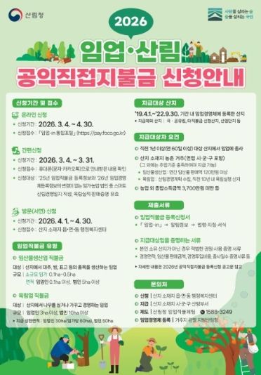 임업직불금 신청은 오는 3월 1일부터 4월 30일까지 ‘임업-in 통합포털’에서 온라인으로 신청이 가능하며 4월 1일부터 4월 30일까지는 가장 큰 면적을 가진 산지소재지 읍․면사무소에 방문하여 신청하면 된다.