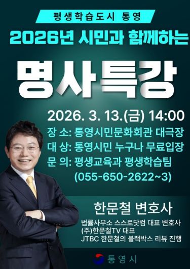 이번 강연은 '평생학습도시 통영, 2026년 시민과 함께하는 명사초청 강연'의 첫 번째 순서로 마련됐으며, 교통사고 전문 변호사로 널리 알려진 한문철 변호사가 강연자로 나선다.