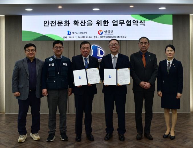 (포탈뉴스통신) 대구도시개발공사는 2월 26일 본사 회의실에서 (사)대구안전생활실천시민연합과 ‘안전문화 확산을 위한 업무협약’을 체결했다.