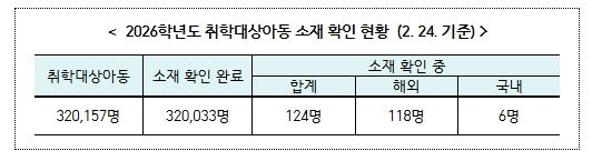 경찰청(경찰청장 직무대행 유재성)은 2026년 2월 24일 기준 소재가 확인되지 않은 124명의 아동에 대해 수사를 이어가고 있다. 이 중 118명은 해외 출국 사실이 확인되어 외교부 및 현지 공관과 협조해 현지 경찰에 수사를 요청하고 있으며, 국내 거주가 추정되는 6명에 대해서도 계속해서 수사를 진행할 계획이다.