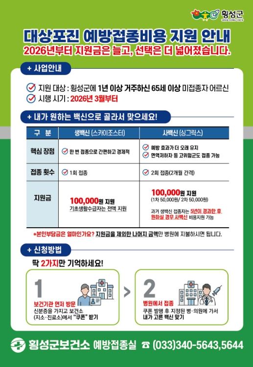 김영대 횡성군보건소장은 “대상포진은 어르신들의 삶의 질을 저해하는 대표적인 질환인 만큼, 이번 지원 확대를 통해 많은 분이 예방접종 혜택을 받고 건강한 노후를 보내시길 바란다”고 말했다.