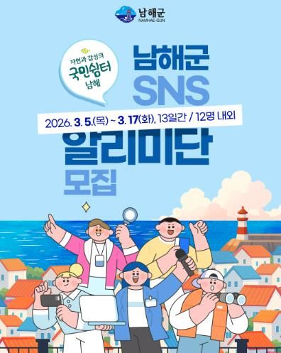 (포탈뉴스통신) 남해군이 ‘2026년 자연과 감성의 국민쉼터’ 남해의 다채로운 매력을 널리 전파할 ‘제9기 남해군 SNS 알리미단’을 오는 3월 5일부터 17일까지 13일간 모집한다.