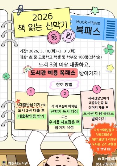 (포탈뉴스통신) 부산광역시립해운대도서관(관장 노장석)은 오는 10일부터 31일까지 초·중·고등학교 학생 및 학부모 100명을 대상으로 ‘2026 책 읽는 신학기 응원 북패스’ 행사를 운영한다.
