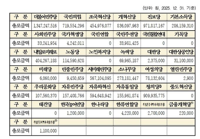 (포탈뉴스통신) 중앙선거관리위원회는 2025년도 중앙당후원회와 국회의원후원회의 후원금 모금내역을 집계한 결과, 37개의 중앙당(중앙당창당준비위원회 포함)후원회가 총 81억 7천8백여만 원을, 303개의 국회의원후원회가 총 608억 3천2백여만 원을 모금했다고 밝혔다.