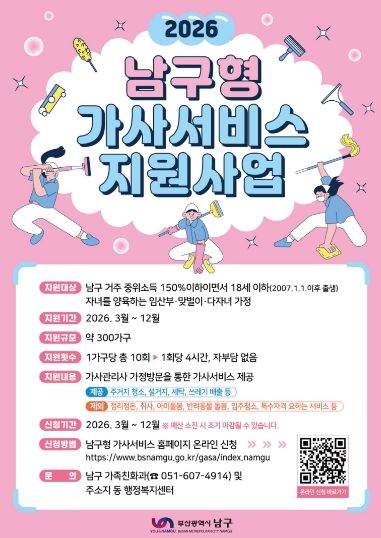 (포탈뉴스통신) 부산 남구는 임산부·맞벌이·다자녀 가정의 가사 부담을 완화하기 위해 '2026년 남구형 가사서비스 지원사업'을 3월 9일부터 시행한다고 밝혔다.