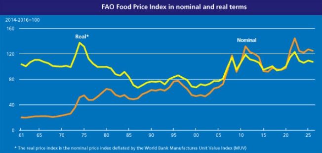 (포탈뉴스통신) 유엔 식량농업기구(FAO)에 따르면, 2026년 2월 세계식량가격지수는 전월(124.2포인트) 대비 0.9% 상승한 125.3포인트를 기록했다. 품목군별로 유제품, 설탕 가격은 하락하고 곡물, 유지류, 육류 가격은 상승했다.
