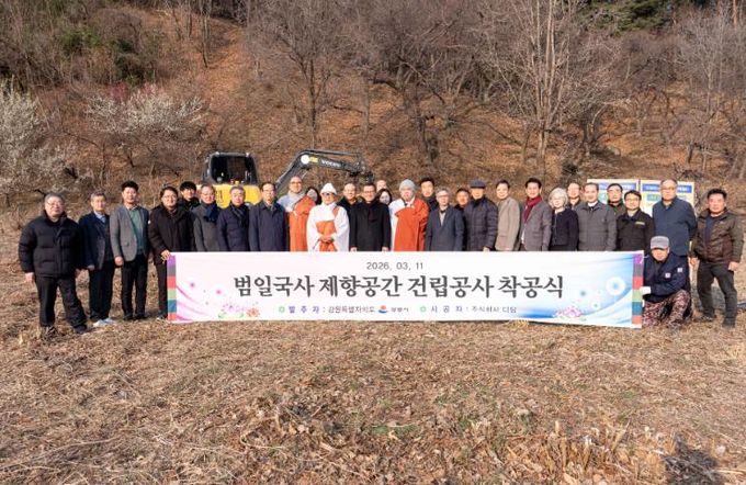 이날 착공 법회에는 김홍규 강릉시장을 비롯해 범일국사 선양회 회장을 맡고 있는 등명낙가사 주지 청우 스님과 범일국사선양회원 등 관계자 약 80명이 참석한 가운데 진행됐다.