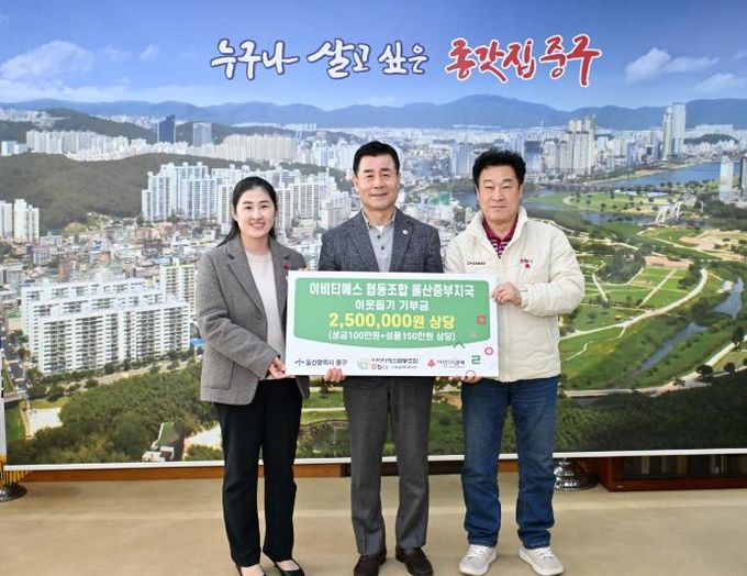 (포탈뉴스통신) 이비티에스 협동조합 울산중부지국이 3월 11일 오후 2시 중구청 구청장실을 찾아 울산사회복지공동모금회를 통해 이웃돕기 후원금 100만 원과 쌀, 라면, 커피 등 150만 원 상당의 후원 물품을 전달했다.