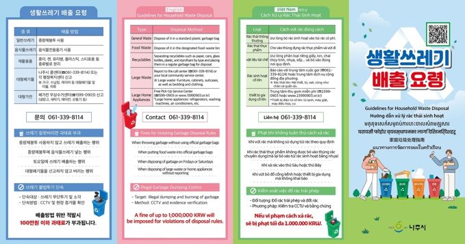 시는 먼저 생활폐기물 부적정 배출을 예방하기 위해 내국인뿐 아니라 외국인 거주자를 대상으로 생활폐기물 배출 방법을 안내하는 다국어 홍보물을 제작해 배포했다.