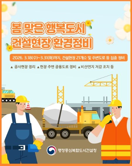 (포탈뉴스통신) 행정중심복합도시건설청은 3월 18일부터 31일까지 행복청 발주·인허가 건설현장 21개소를 대상으로 봄맞이 환경정비를 실시한다.