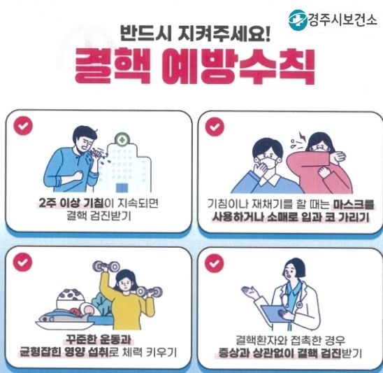 경주시는 읍·면·동 행정복지센터와 버스승강장 전광판을 활용해 결핵 예방수칙과 보건소 결핵검진 안내를 집중 홍보하고, 보건소 홈페이지 팝업 등 온라인 채널을 통해서도 결핵 예방정보를 널리 알릴 계획이다.
