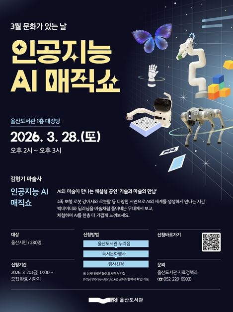 (포탈뉴스통신) 울산도서관은 오는 3월 28일 오후 2시 도서관 1층 대강당에서 3월 문화가 있는 날 행사로 ‘인공지능(AI) 마술(매직)쇼’ 공연을 개최한다고 밝혔다.