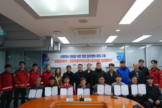 (포탈뉴스통신) 산림청 산림항공본부는 3월 18일 강원특별자치도 드론스포츠협회(11개 시·군)와 산림재난 대응 역량 강화를 위한 업무협약(MOU)을 체결했다고 밝혔다.