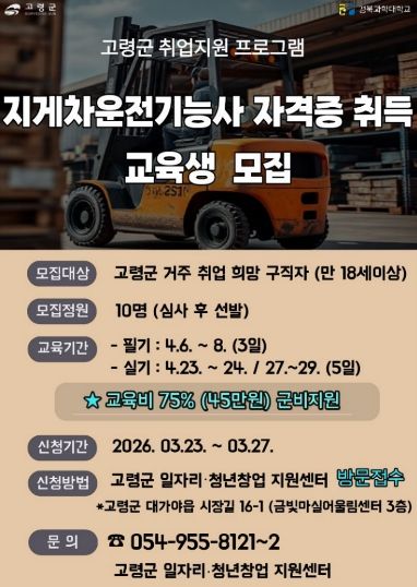 (포탈뉴스통신) 고령군은 구직자의 취업 역량강화를 위해 '고령군 일자리·청년창업지원센터'주관으로 지게차운전기능사 취득 지원사업 교육생을 모집하고 있다.