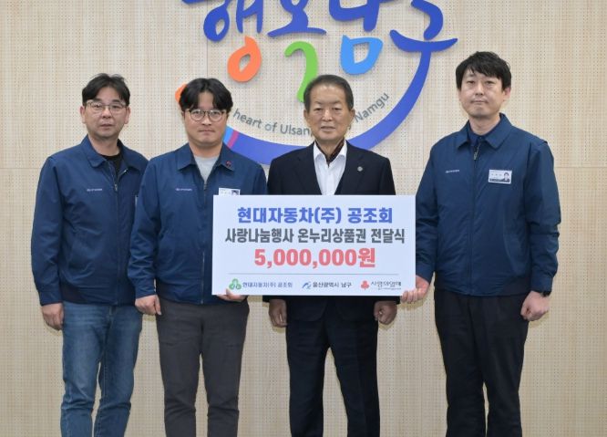 (포탈뉴스통신) 상부상조의 정신으로 꾸준한 나눔을 이어가는 현대자동차(주) 공조회(회장 박상옥)는 23일 남구청을 방문해 관내 저소득층 지원을 위한 500만 원 상당의 온누리상품권을 전달했다.