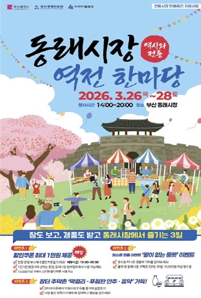 (포탈뉴스통신) 부산시는 26일부터 3월 28일까지 3일간 동래시장과 충무동 새벽시장에서 소비 진작을 위한 '전통시장 판매촉진 지원행사'를 개최한다고 밝혔다.