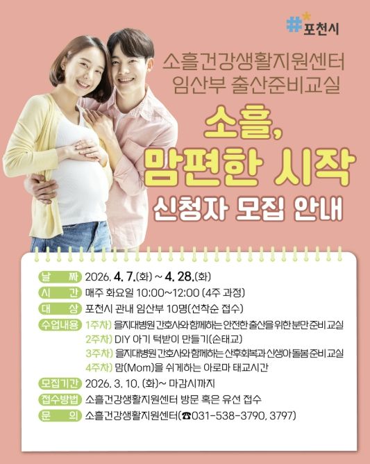 (포탈뉴스통신) 포천시 소흘건강생활지원센터는 임산부의 건강한 임신과 안전한 출산을 지원하기 위해 임산부 출산준비교실 ‘소흘, 맘편한 시작’ 참여자를 모집한다.