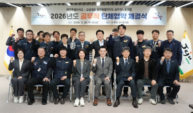 (포탈뉴스통신) 제주특별자치도와 교섭대표 노동조합인 제주도 공무직노동조합이 26일 도청 삼다홀에서 ‘2026년도 공무직 단체협약’을 체결했다.