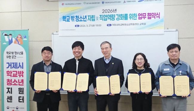 (포탈뉴스통신) 거제시학교밖청소년지원센터는 지난 27일 센터 교육실에서‘2026년 학교 밖 청소년 자립 및 직업역량 강화를 위한 업무협약(MOU)’를 체결했다.