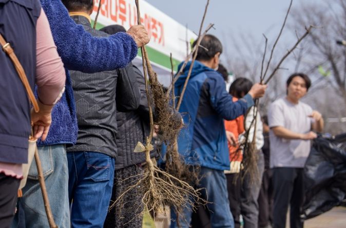 군은 대추나무·감나무·호두나무 등 유실수 묘목 1800본을 준비해 오후 2시부터 1인당 3본씩 선착순으로 배부했다.