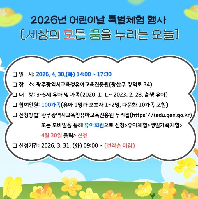 행사 참여 신청은 오는 31일 오전 9시부터 광주유아교육진흥원 누리집에서 선착순 100가정을 받는다. 이중 10가정은 다문화가정을 우선 선발한다.