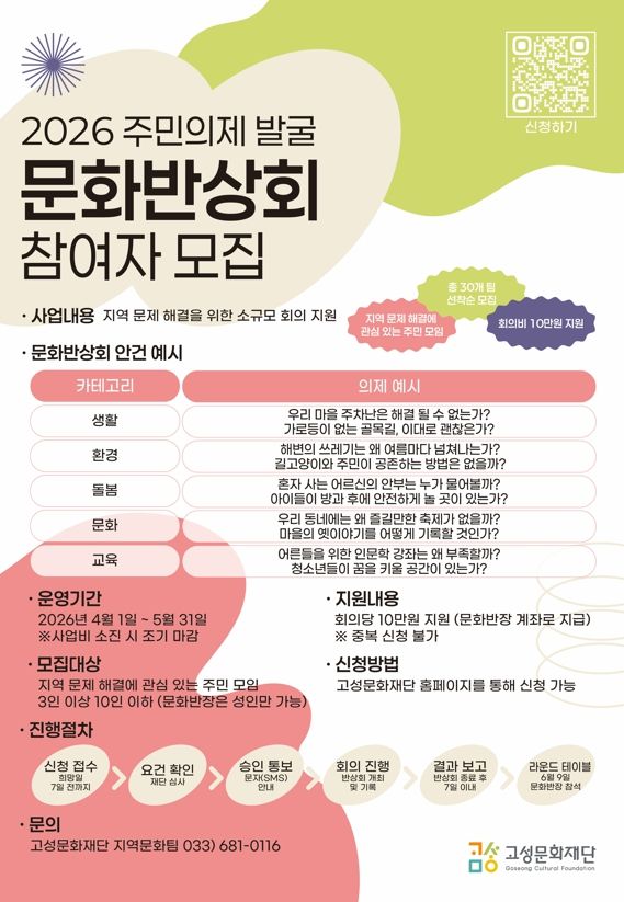 (포탈뉴스통신) 고성문화재단은 주민 스스로 지역의 문제를 진단하고 대안을 모색하는 2026 주민의제 발굴 '문화반상회' 참여 모임을 오는 4월 1일 수요일부터 5월 31일 일요일까지 모집한다.
