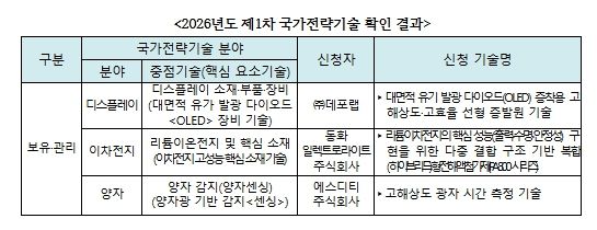 (포탈뉴스통신) 과학기술정보통신부와 한국과학기술기획평가원(원장 직무대행 황지호,)은 ‘2026년도 제1차 국가전략기술 확인 신청’에 대해 총 3건의 기술(디스플레이, 이차전지, 양자 분야)이 국가전략기술에 해당하는 것으로 확인했다.