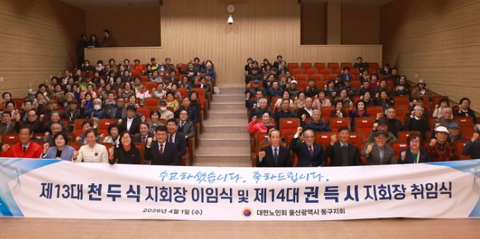 (포탈뉴스통신) 대한노인회 울산 동구지회(지회장 권득시)는 4월 1일 오전 10시 동구청 5층 중강당에서 경로당 회장 및 총무, 지회 임원 등 160여 명이 참석한 가운데 노인지회장 이취임식 및 2026년도 노인 지도자 업무 연찬회를 가졌다.
