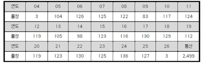 3월 31일 기준 통산 출장 경기 수 10위 이내의 선수 중 강민호가 유일한 포수로 이름을 올리고 있다. 포수 포지션에도 불구하고, 철저한 자기관리로 23년차인 지금까지 단 3시즌을 제외하고 모두 100경기 이상 출장하며 꾸준함을 보여줬다.