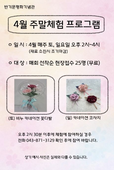 (포탈뉴스통신) 음성군 제8대 유엔사무총장 반기문 평화기념관에서는 관람객을 위한 4월 주말 무료 체험 프로그램을 운영한다.