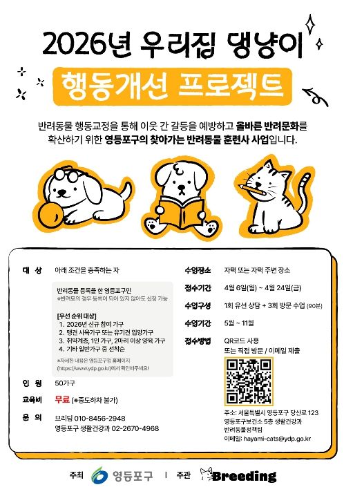 모집 대상은 반려동물 등록을 완료한 영등포구민 50가구이며, 신청자가 많을 경우 신규 참여 가구, 맹견 사육 가구, 유기견 입양 가구 등을 우선 선발한다. 신청 기간은 오는 6일부터 24일까지이며, 온라인, 방문, 이메일로 접수할 수 있다. 교육비는 전액 무료다. 자세한 내용은 구청 누리집에서 확인하면 된다.