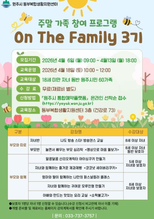 (포탈뉴스통신) 원주시 동부복합생활지원센터는 오는 18일, 주말 가족 참여 프로그램 ‘온 더 패밀리(On The Family)’ 3기 과정을 운영한다.