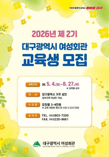 (포탈뉴스통신) 대구광역시 여성회관은 시민들의 자기계발을 돕고 평생학습 기회를 확대하기 위해 4월 6일부터 ‘2026년 제2기 교육생’을 모집한다.