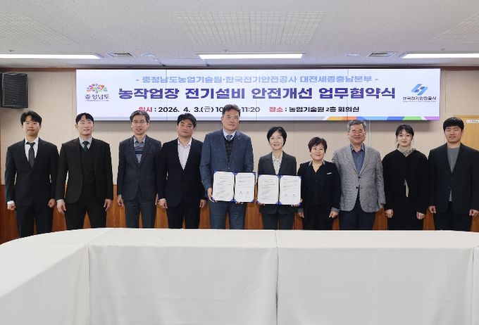 (포탈뉴스통신) 충남도 농업기술원은 3일 기술원 회의실에서 한국전기안전공사 대전세종충남본부와 ‘농업현장 전기설비 안전진단 및 기술지원’을 위한 업무협약(MOU)을 체결했다.