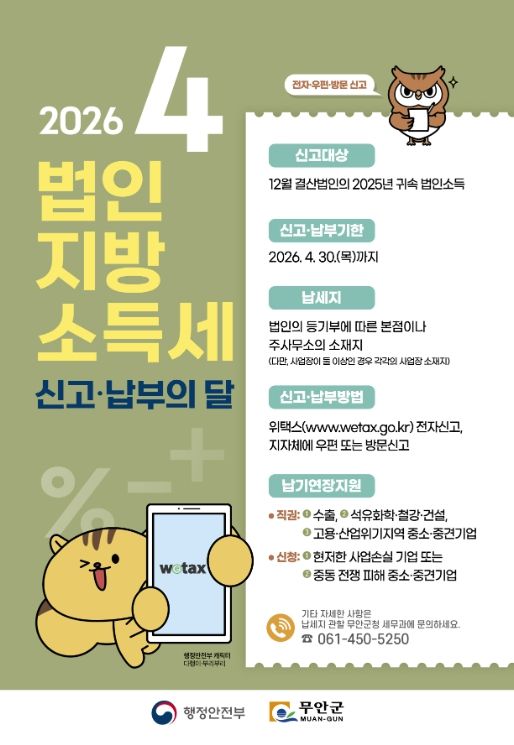 (포탈뉴스통신) 전남 무안군은 법인 소득에 대해 지방자치단체에 납부하는 법인지방소득세 신고·납부 기간을 맞아 오는 4월 30일까지 집중신고기간을 운영한다고 밝혔다.
