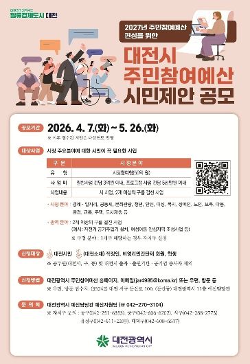 (포탈뉴스통신) 대전시는 4월 7일부터 5월 26일까지 2027년도 주민참여예산 편성을 위한 시민제안 공모를 시작한다.