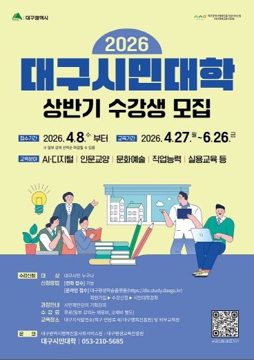 (포탈뉴스통신) 대구광역시는 시민의 평생학습 기회를 확대하고 변화하는 학습 수요를 반영해 4월 8일부터 ‘2026년 상반기 대구시민대학’ 수강생을 모집한다.