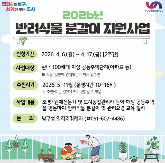 (포탈뉴스통신) 부산 남구는 구민들의 반려식물 관리에 대한 이해를 돕고 관리 능력을 높이기 위해 ‘2026년 반려식물 분갈이 지원사업’에 참여할 공동주택을 모집한다고 밝혔다.