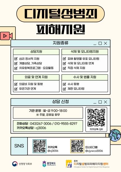 충북디지털성범죄피해자지원센터는 불법촬영물 삭제 지원을 비롯해 상담, 치료·회복 프로그램, 수사·법률 연계, 의료 지원 등 피해자 맞춤형 서비스를 제공하고 있으며, 2026년 1분기 기준 총 217건의 피해자를 지원했다. 주요 지원내용은 상담 135건, 삭제 지원 28건, 치료·회복 프로그램 30건, 수사·법률 지원 7건, 의료 지원 17건 등으로 나타났다.