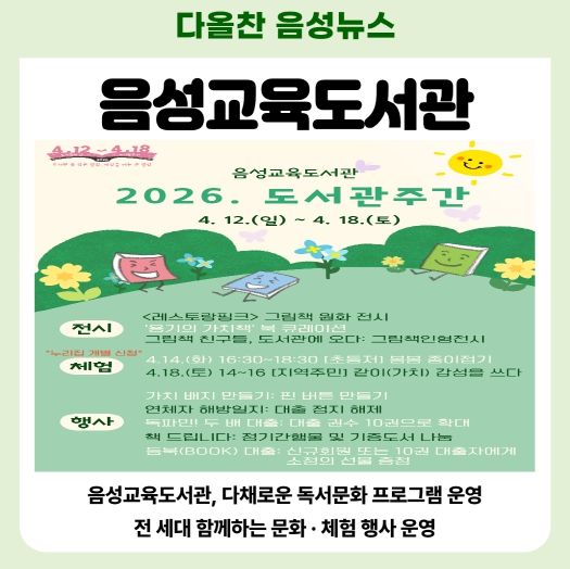 (포탈뉴스통신) 음성교육도서관은 제62회 도서관주간을 맞아 4월 12일부터 4월 18일까지 ‘도서관 속 작은 펼침, 세상을 여는 큰 열림’을 주제로 유아, 학생, 학조부모 및 지역주민 등 전 연령층이 함께 참여할 수 있는 다양한 독서문화 프로그램을 운영한다.