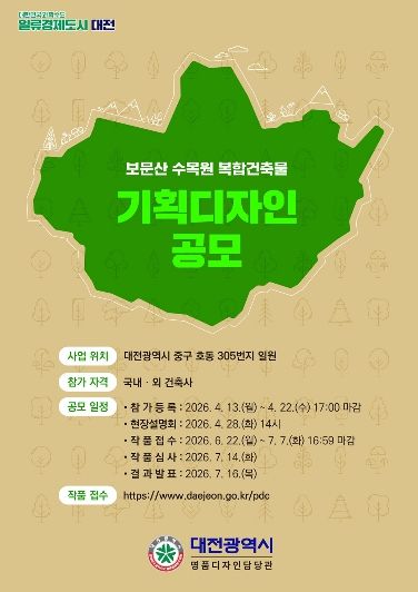 (포탈뉴스통신) 대전시는 보문산의 자연자원을 활용한 산림형 수목원 조성을 위해 ‘보문산수목원 복합건축물 및 기타시설’ 기획디자인 국제 일반공모를 시행한다.