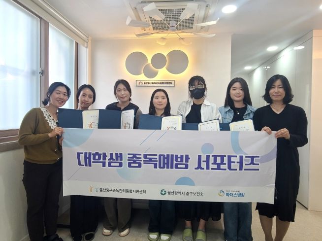 이날 울산중구중독관리통합지원센터는 제5기 중독예방 대학생 응원단(서포터스)으로 활동하게 된 지역 대학생 7명에게 임명장을 수여했다.