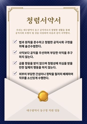 (포탈뉴스통신) 대구 동구청은 청렴 문화 확산과 공직기강 확립을 위해 청렴한 생활을 통해 모범이 될 것을 다짐하는 ‘청렴서약서’를 제작해 구청 부서 및 동행정복지센터 출입구에 부착했다.