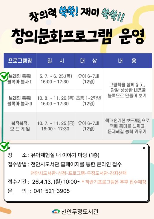 프로그램 접수는 이달 13일 오전 10시부터 천안시도서관 누리집에서 가능하며, 자세한 내용은 두정도서관으로 문의하면 된다.