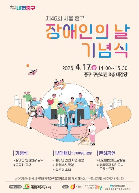 (포탈뉴스통신) 서울 중구가 오는 17일 오후 2시, 중구구민회관 3층 대강당에서 '제46회 장애인의 날 기념식'을 개최한다.