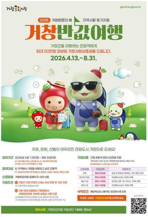 한편, ‘거창반값여행’ 2차 사전신청은 오는 2026년 5월 11일부터 진행될 예정이며, 여행기간은 5월 14일부터 6월 13일까지로 다시 한번 청정 관광도시 거창에 방문하길 원하는 관광객들의 많은 관심과 참여가 이어질 것으로 기대된다.