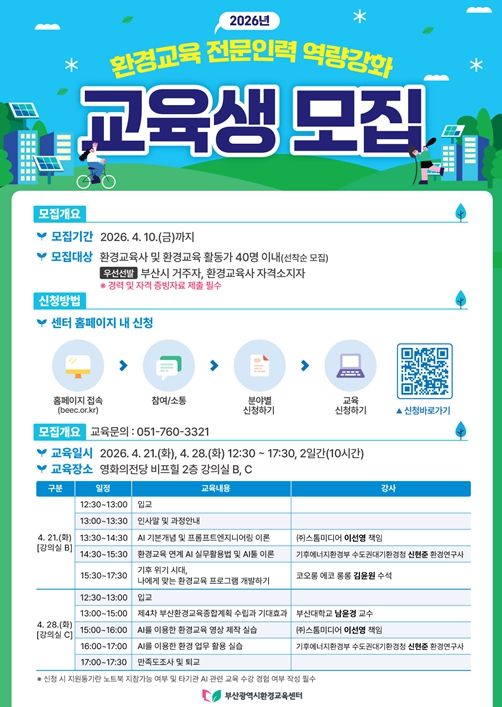 (포탈뉴스통신) 부산시는 변화하는 환경정책과 교육 수요에 대응하고 지역 환경교육 전문인력의 역량 강화를 위해 오는 4월 21일과 28일 이틀간 해운대구 영화의전당에서 '2026년 환경교육 전문인력 역량강화 교육'을 실시한다고 밝혔다.