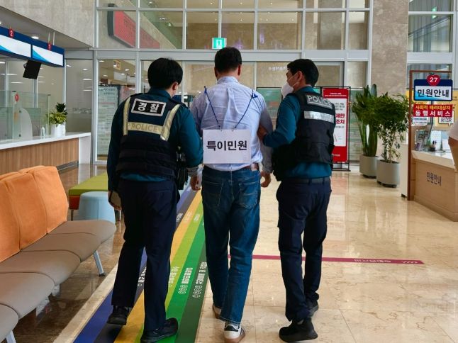 훈련은 민원 응대 과정에서 폭언과 폭력이 발생한 상황을 가정해 △상급자 개입을 통한 진정 및 중재 △사전 고지 후 녹음·녹화 △비상벨 작동 △피해 공무원 및 방문 민원인 대피 △가해 민원인 제압 및 경찰 인계 등 대응 매뉴얼에 따라 진행됐다.